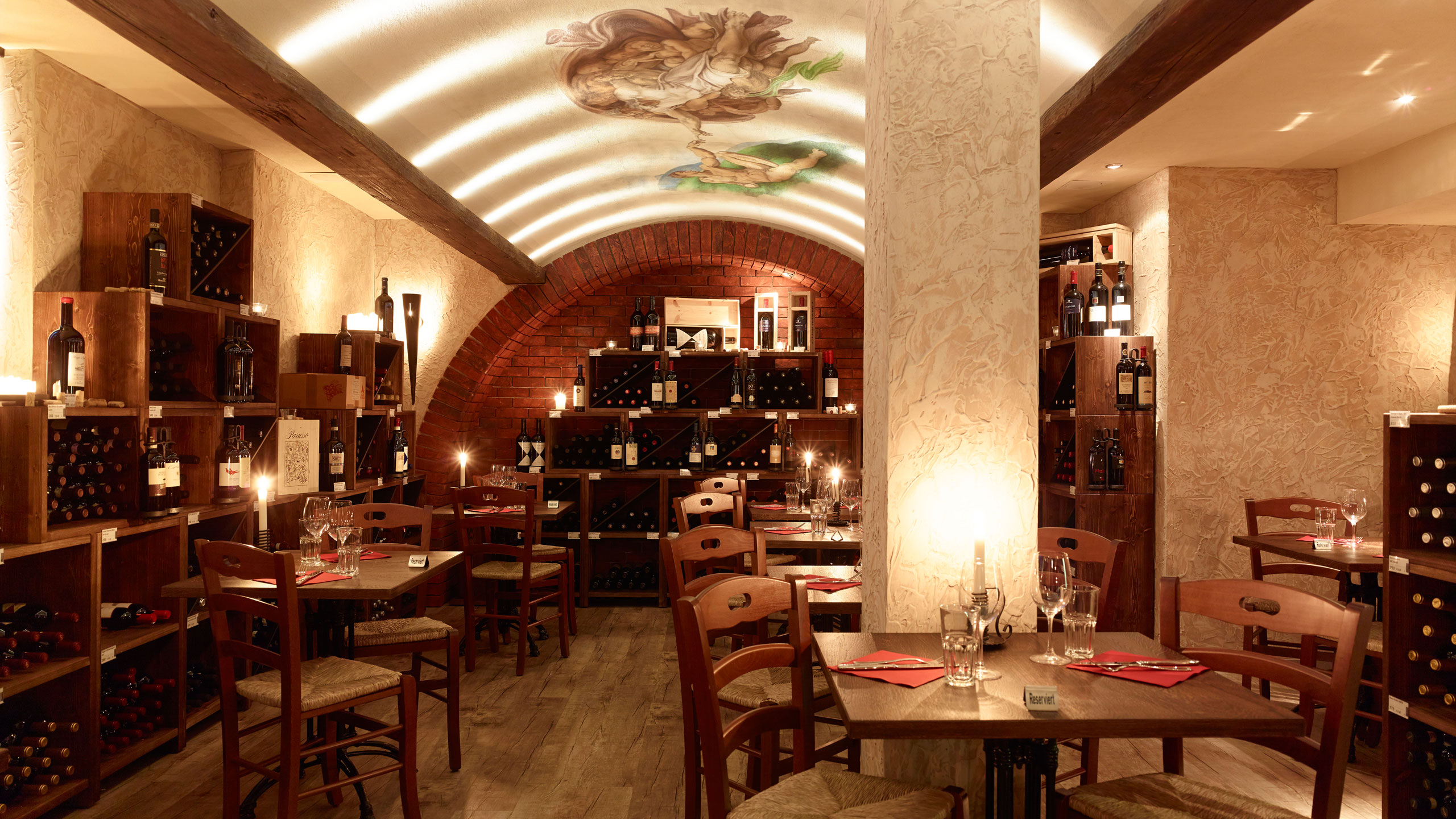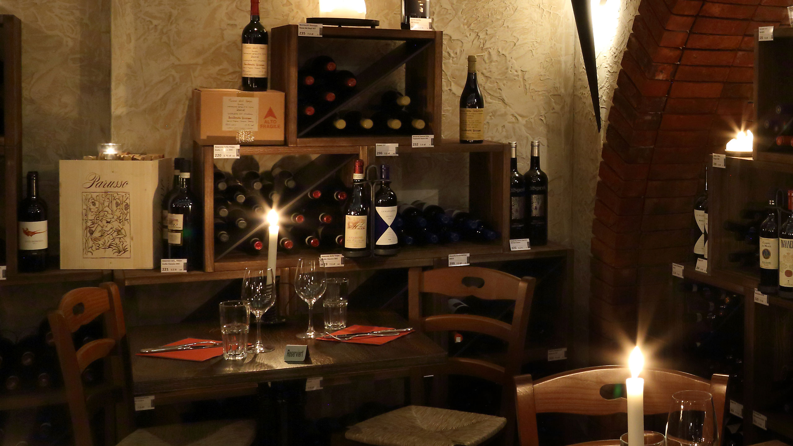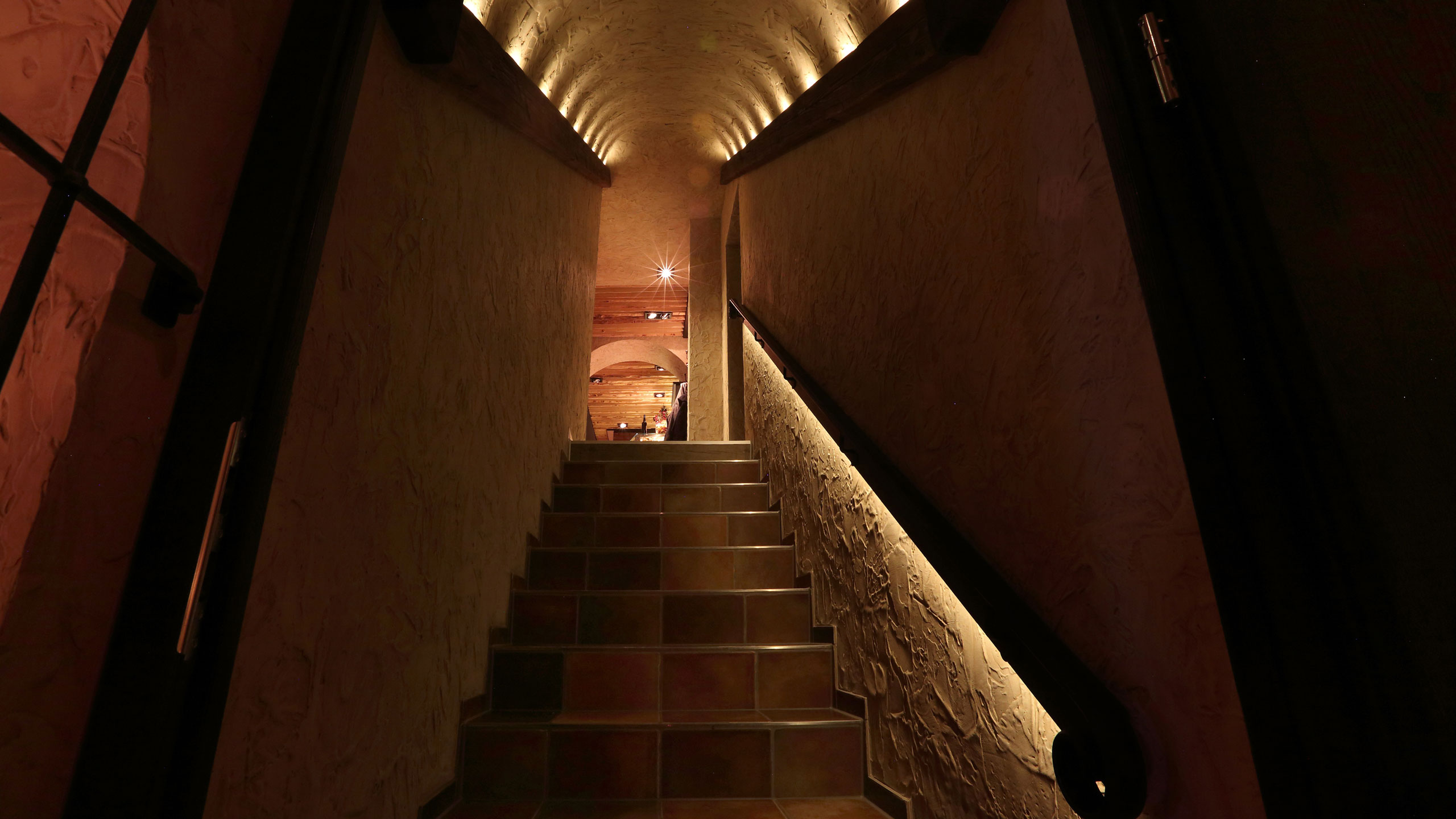 In unserem Grottino im ersten Untergeschoss bieten wir Ihnen das Caruso-Angebot bei einer ganz speziellen Atmosphäre. Diverse Lichter erhellen den von Holz und Stein geprägten Raum, während Sie umgeben von Weinflaschen speisen.